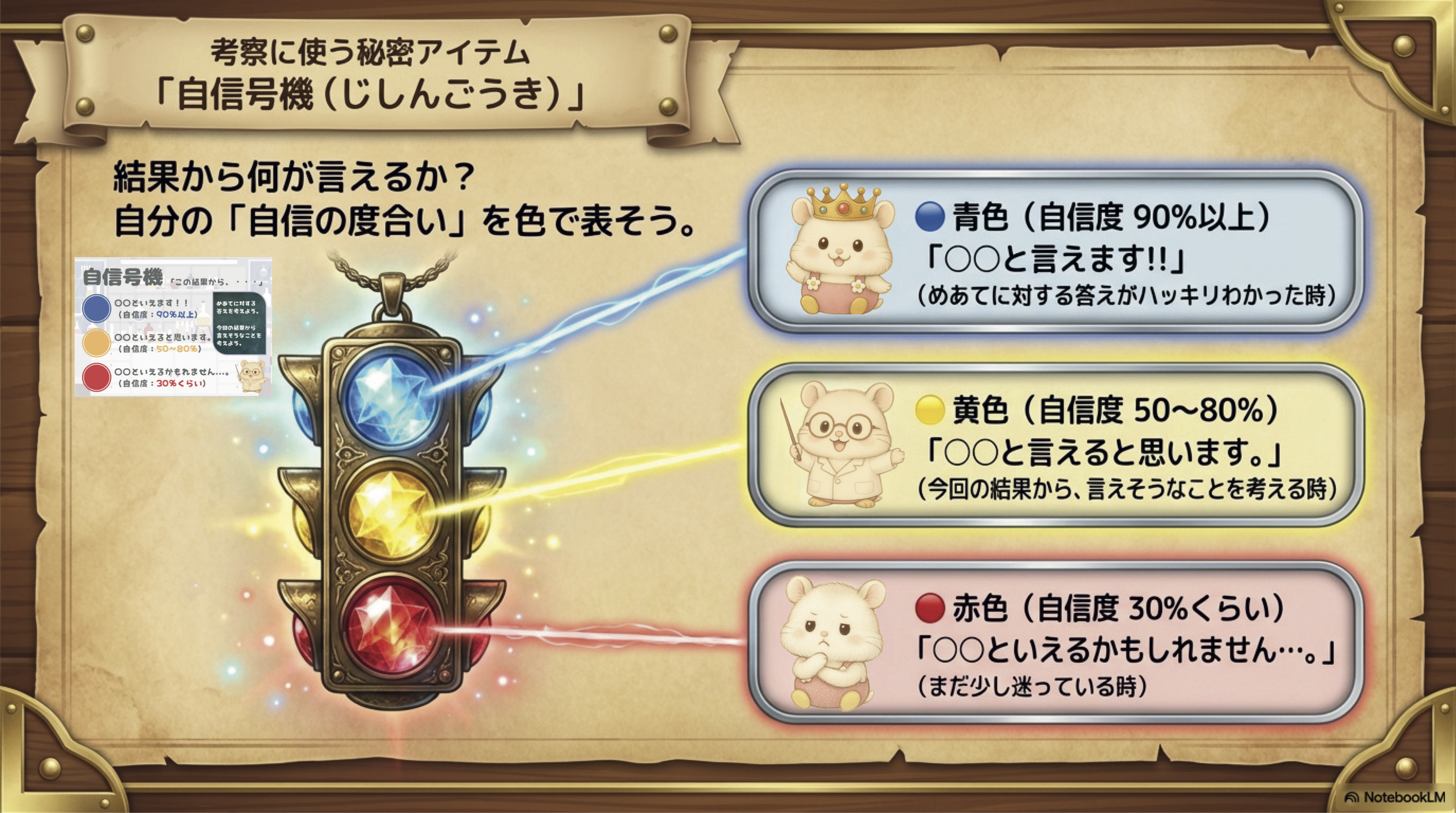 自分の考察の質を信号機(青・黄・赤)で自己確認。メタ認知を促し、ふり返りの出発点にする。