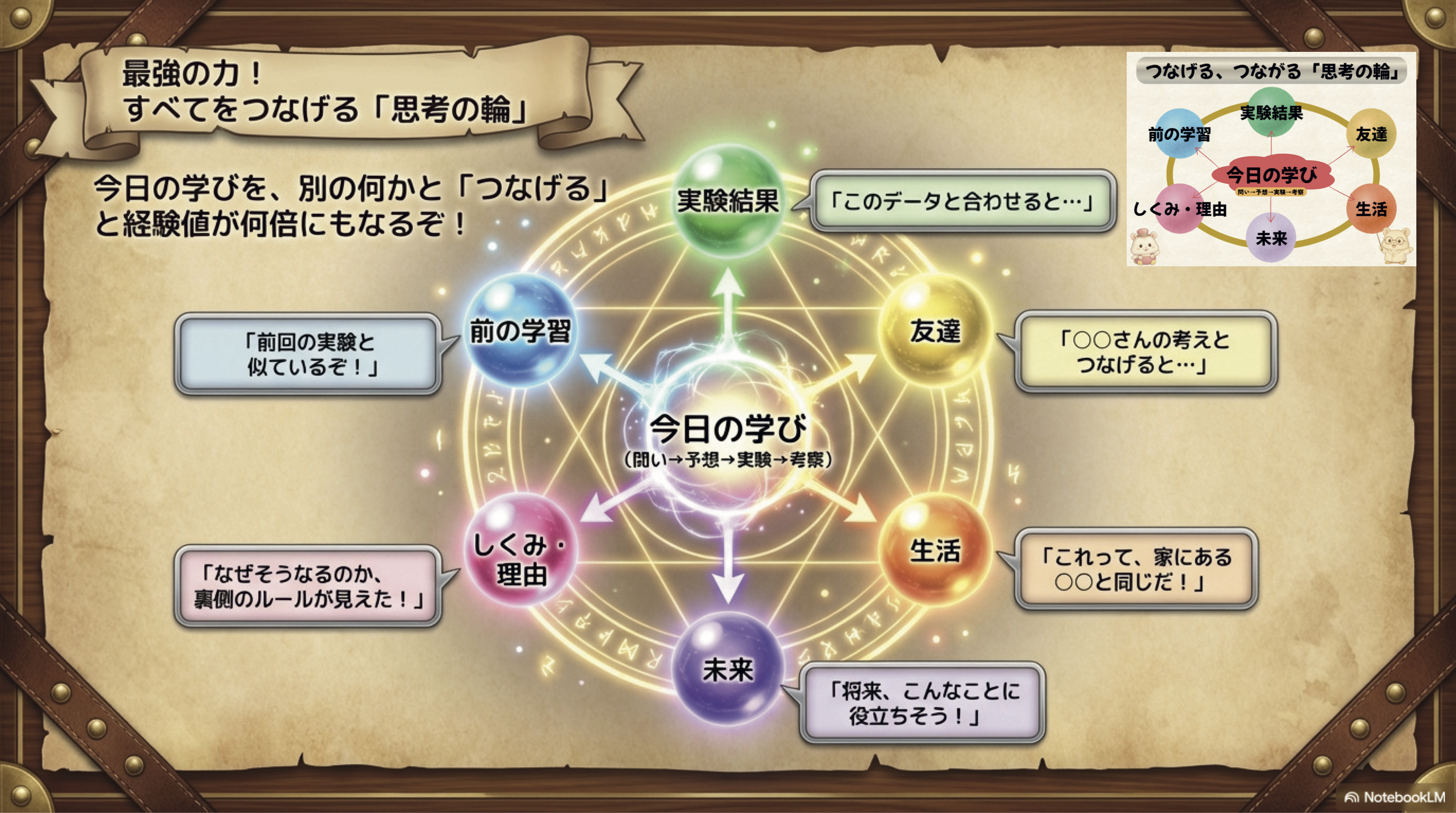 今日の学びを中心に、前の学習・実験結果・友達・生活・未来・しくみ・理由の6方向でつながりを可視化する。